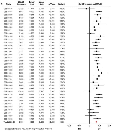 The following are available online at https://www.mdpi.com/article/10.3390/biology10090834/s1, Figure S1: AR mRNA expression is significantly increased in BC patients with low histological grade. Results from the primary analysis. Forest plots of SMD comparing AR mRNA levels in BC patients with histological grade 3 vs. BC patients with histological grade 1 (A), and grade 2 (B). Figure S2: AR mRNA expression is higher in BC patients expressing either ER, PgR, and HER2. Results from the primary analysis. Forest plots of SMD showing AR mRNA levels associated with ER+ (A), PgR+ (B), ER+/PgR+ (C), and HER2+ status (D). Figure S3: Forest plot showing that AR mRNA expression is higher in BC patients expressing ER+/PgR+. Figure S4: AR mRNA level is significantly increased in patients categorized within the less aggressive intrinsic molecular subtypes. Results from the primary analysis. Forest plots of SMD comparing AR mRNA levels in BC patients classified as Basal-like subtype vs. Luminal A (A), Luminal B (B), and HER2-enriched subtypes (C). Figure S5: AR mRNA level is significantly increased in patients categorized with less aggressive IHC-surrogate subtypes. Results from the primary analysis. Forest plots of SMD comparing AR mRNA levels in BC patients classified as TNBC subtype vs. Luminal A (A), Luminal B (B) and HER2-enriched subtypes (C). Figure S6: Funnel plots for main meta-analyses in the primary analysis. (A) Association between AR mRNA level in BC patients with histological grade 3 vs. BC patients with histological grade 1, and (B) histological grade 2 (C). AR mRNA levels associated with ER (D), PgR (E), ER/PgR (F), and HER2 status (G). Figure S7: Funnel plots for main meta-analyses after sensitivity analysis. (A) Association between AR mRNA level in BC patients with histological grade 3 vs. BC patients with histological grade 1, and (B) histological grade 2 (C). AR mRNA levels associated with ER (D), PgR (E), ER/PgR (F), and HER2 status (G). Figure S8: Funnel plots for main meta-analyses in the primary analysis. Association between AR mRNA level in BC patients classified with the intrinsic molecular subtypes Basal-like vs. Luminal A (A), Luminal B (B), HER2-enriched (C), and Normal-like (D). Association between AR mRNA level in BC patients classified with the IHC-surrogate subtypes TNBC vs. Luminal A (E), Luminal B (F), and HER2-enriched (G). Figure S9: Funnel plots for main meta-analyses after sensitivity analysis. Association between AR mRNA level in BC patients classified with the intrinsic molecular subtypes Basal-like vs. Luminal A (A), Luminal B (B), HER2-enriched (C), and Normal-like (D). Association between AR mRNA level in BC patients classified with the IHC-surrogate subtypes TNBC vs. Luminal A (E), Luminal B (F), and HER2-enriched (G). Table S1. Overview of the datasets selected from GEO for clinicopathological analyses. Table S2. Heterogeneity analysis and publication bias based on Egger’s test.