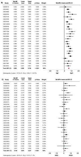 From fifty microarray datasets, information about status of ER (7841 patients), PgR (4684 patients) and HER2 (4479 patients) was included in the primary analysis. The AR mRNA levels were significantly increased in women with ER+ BC (SMD: 0.634; 95% CI: 0.488–0.780; p < 0.001) (Supplementary Figure S2A) and in PgR+ BC patients (SMD: 0.576; 95% CI: 0.433–0.718; p < 0.001) (Supplementary Figure S2B). A similar increase was observed in ER+/PgR+ cases compared to ER+/PgR− cases (SMD: 0.187; 95% CI: 0.065–0.309; p = 0.003) (Supplementary Figure S2C). The heterogeneity was substantial for ER and PgR, and moderate for ER/PgR. After sensitivity analyses were conducted, we still observed a trend of the pooled effect towards a higher AR mRNA levels in BC patients expressing either ER (Figure 3A), PgR (Figure 3B) or being ER+/PgR+ (SMD: 0.210; 95% CI: 0.096–0.323; p < 0.001) (Supplementary Figure S3). Here, the heterogeneity was moderate for ER and PgR, but low for ER/PgR.