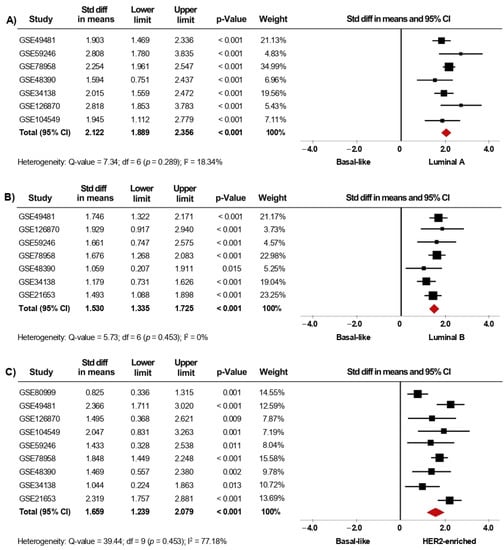 Since gene-expression profiling has had a considerable impact on the classification of BC, we next investigated whether the expression of AR is associated with the intrinsic molecular subtypes. In the primary analysis, fifteen microarray datasets with clinical information of BC patients classified as Luminal A (1168 cases), Luminal B (643 cases), HER2-enriched (359 cases), Basal-like (589 cases), and Normal-like (223 cases) were included in the meta-analysis. Our results showed that AR mRNA levels were higher in tumor tissues from patients classified as Luminal A, Luminal B, HER2-enriched, and Normal-like subtypes, when each one of them was compared to tissues from Basal-like cases (p < 0.001). Interestingly, after performing sensitivity analyses (Figure 4A–C), the findings were consistent with those from the primary analyses (Supplementary Figure S4A–C) and led to similar conclusions. Furthermore, the same association was found when comparing Luminal A, Luminal B, and HER2-enriched subtypes to Normal-like subtype (p < 0.001) (Table 2). In addition, AR gene expression was higher in Luminal A than in Luminal B (p < 0.001). However, there were no significant differences in AR mRNA levels when comparing Luminal A and Luminal B subtypes to HER2-enriched subtype (Table 2). Analyses of heterogeneity, as well as publication bias based on the funnel plots and Egger’s test, are presented in Supplementary Table S2, Supplementary Figures S8A–D and S9A–D.