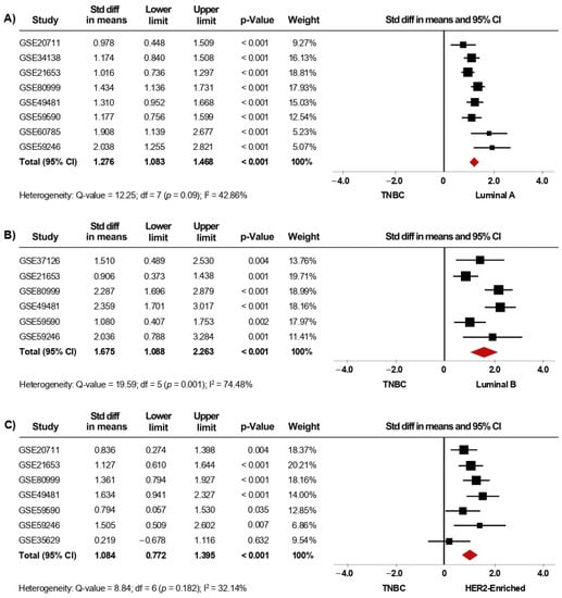 Furthermore, given the clinical relevance of BC subtype classification, we also evaluated the association of AR expression with the IHC-surrogate subtypes. In the primary analysis, thirteen microarray datasets, including luminal A (1232 cases), luminal B (170 cases), HER2-enriched (199 cases), and TNBC (530 cases) patients were included in this meta-analysis. Herein, AR mRNA expression was significantly higher in tumor tissues from patients classified as Luminal A, Luminal B, and HER2-enriched compared to tissues from TNBC cases (p < 0.001). When the pooled effect was evaluated in sensitivity analyses (Figure 5A–C), the conclusions were consistent with those of the primary analyses (Supplementary Figure S5A–C). Furthermore, AR mRNA levels were higher in Luminal A than in HER2-enriched tumors (p = 0.02), but, in contrast, there were no significant differences in AR mRNA levels when comparing Luminal B to HER2-enriched subtypes (Table 2). Analyses of heterogeneity are detailed in Supplementary Table S2. Moreover, results concerning publication bias based on the funnel plot and Egger’s test are presented in Supplementary Figure S8E–G, as well as in Supplementary Figure S9E–G.