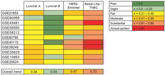 Finally, as we observed some differences between the results from intrinsic molecular subtypes and IHC-surrogate subtypes and their association with AR gene expression, we have provided an overview of the agreement between them. We included 11 studies in this analysis and, based on Cohen’s kappa (k), the agreement between Basal-like (molecular) and TNBC (IHC-surrogate) subtypes was predominantly substantial. Furthermore, the agreement of both classification systems was fair to moderate when analyzing Luminal A and HER2-enriched subtypes, but a slight concordance was observed when analyzing Luminal B tumors between molecular and IHC-surrogate subtype classification (Figure 6).