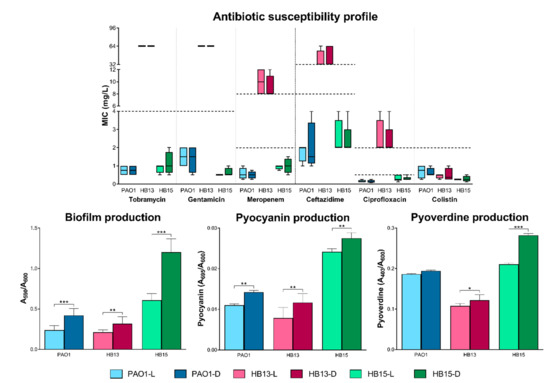 Comparing the phenotypic response of the three P. aeruginosa grown in the two extreme luminosity conditions, a difference in the production of key pathogenesis mediators became apparent. Despite showing no differences in the antibiotic susceptibility profile, other virulence-associated phenotypes were altered in response to this abiotic factor (Figure 1 and Figure 2).