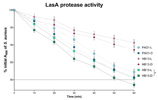 Levels of LasA protease activity of Pseudomonas aeruginosa grown in constant exposure to full-spectrum light (L) and total absence of light (D). LasA protease activity measured as the decrease in the absorbance at 600 nm of a S. aureus boiled culture [22]. The dotted line represents the cut-off for LasA overexpression, expressed as a final absorbance lesser than 80%. Statistical comparisons performed by two-way ANOVA, followed by Tukey’s post hoc test for multiple comparisons. Significant differences comparing the two growth conditions are indicated as: * p < 0.05.