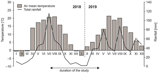 During the sampling period (from July 2018 to April 2019), the annual mean temperature in the study area was 8.5 °C and the total annual rainfall was 330 mm. In the studied region, the highest mean temperature reached 20.7 °C in summer, while the lowest value (−0.4 °C) was recorded in winter. Based on the regional long-term data (2013–2018), the mean air temperature was 8.5 °C and mean total precipitation was 556 mm. Data for individual months are shown in Figure 1. The average temperature of the soils in situ were: 19.3 °C in summer, 9.9 °C in autumn, 2.5 °C in winter and 9.5 °C in spring.