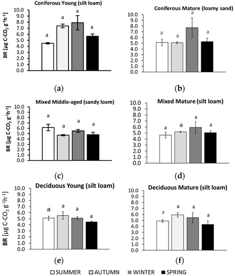 Basal respiration (BR) in soil samples collected in summer, autumn, winter, and spring from different forest sites (average values ± standard deviation; n = 3). (a) Coniferous Young (silt loam); (b) Coniferous Mature (loam sand); (c) Mixed Middle-aged (sandy loam); (d) Mixed Mature (silt loam); (e) Deciduous Young (silt loam); (f) Deciduous Mature (silt loam). Different letters indicate significant differences (a non-parametric Kruskal–Wallis test, p < 0.05, was carried out separately for each season and for each forest).