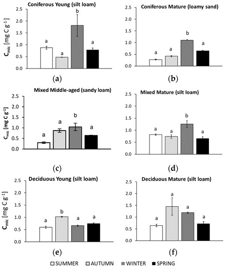 Soil microbial biomass (Cmic) in samples collected in summer, autumn, winter, and spring from different forests (average values ± standard deviation; n = 3). (a) Coniferous Young (silt loam); (b) Coniferous Mature (loam sand); (c) Mixed Middle-aged (sandy loam); (d) Mixed Mature (silt loam); (e) Deciduous Young (silt loam); (f) Deciduous Mature (silt loam). Different letters indicate significant differences (a non-parametric Kruskal–Wallis test, p < 0.05, was carried out separately for each season and for each forest).
