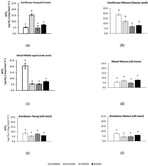 The metabolic quotient (qCO2) in soil samples collected in summer, autumn, winter, and spring from different forests (average values ± standard deviation; n = 3). (a) Coniferous Young (silt loam); (b) Coniferous Mature (loam sand); (c) Mixed Middle-aged (sandy loam); (d) Mixed Mature (silt loam); (e) Deciduous Young (silt loam); (f) Deciduous Mature (silt loam). Different letters indicate significant differences (a non-parametric Kruskal–Wallis test, p < 0.05, was carried out separately for each season and for each forest).