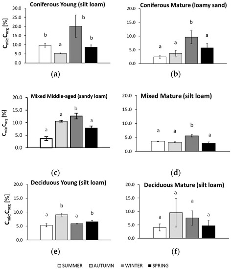 Cmic:Corg ratio in soil samples collected in summer, autumn, winter, and spring from different forests (average values ± standard deviation; n = 3). (a) Coniferous Young (silt loam); (b) Coniferous Mature (loam sand); (c) Mixed Middle-aged (sandy loam); (d) Mixed Mature (silt loam); (e) Deciduous Young (silt loam); (f) Deciduous Mature (silt loam). Different letters indicate significant differences (a non-parametric Kruskal–Wallis test, p < 0.05, was carried out separately for each season and for each forest).
