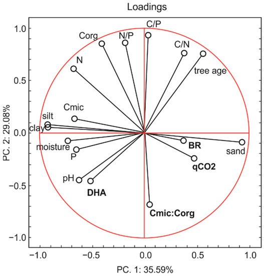 Principal component analysis (Figure 8), including a total of five microbial indicators (BR, Cmic, DHA, qCO2, Cmic:Corg) and twelve parameters (tree age, sand, silt, and clay contents, pH, C, N, P content, moisture, C:P, N:P and C:N) in six forests, confirmed the high sensitivity of different microbial parameters to soil characteristics. The analysis generated two principal components. The first and second principal components (PC1 and PC2) explained 64.67% of the total variability of the data set. PC1 was negatively correlated with DHA, Cmic, pH, P, moisture, silt and clay content, N, Corg, and N/P and positively correlated with BR, qCO2, Cmic:Corg, sand content, tree age, C:N, and C:P. PC2 was negatively correlated with Cmic:Corg, DHA, qCO2, BR, sand content, pH, P, moisture and positively correlated with Cmic, tree age, clay and silt content, N, Corg, N:P, C:P, and C:N.