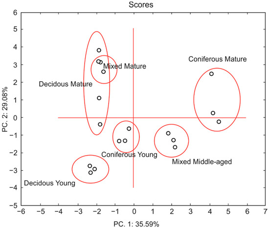 The mature coniferous and middle-aged mixed forests had positive PC1 scores, whereas the young coniferous and deciduous forests and the mature mixed and deciduous forests had negative PC1 scores. Clusters of samples from the mature forests had mostly positive PC2 scores, while those from the younger forests were found in the negative PC2 fields.