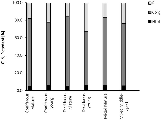 Differences in the allocation of C, N, and P (Table 2, Figure 10) in the different forest types may also affect the microbial parameters. The uptake of C, N, and P normally constrains the growth of a range of organisms. Uptake from the environment is a key function, as these are the most important elements building living organisms [100], and the ratios of C, N, and P are key indicators of the nutritional status of soils [25].