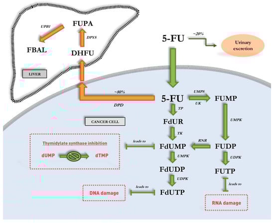 Various key enzymes facilitate the mechanism of action (anabolism) of 5-FU in cancer cells and its elimination (catabolism) via the hepatic system.