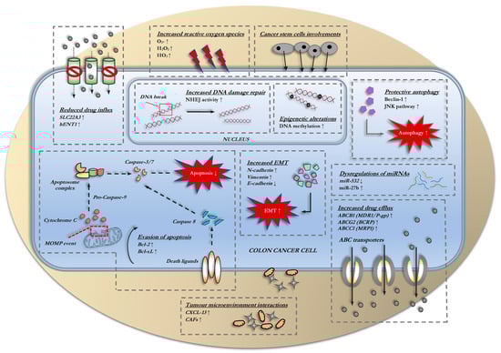 Cancer stem cells (CSCs), also known as “tumor-initiating cells”, are a small subpopulation of cancer cells within tumors that have attained stem cell-like characteristics such as self-renewal and multi-directional differentiation capabilities [100]. There is growing evidence demonstrating the pivotal role of CSCs in tumor initiation, progression, metastases, and cancer recurrence, aside from contributing to intra-tumor heterogeneity [101,102,103,104]. CSCs are poorly differentiated in nature and possess the ability to remain quiescent in the G0 phase of the cell cycle, thus, helping them to escape from chemotherapy insults, which typically targets highly-proliferating and mature cancer cells [105]. Recent studies have also demonstrated the ready capability of CSCs to promote EMT via transcription factor ZEB2 even when untreated [99]. Furthermore, colon CSCs when under chemotherapy stress, may directly prompt the activation of other resistance pathways. These include raised Bcl-2 and Bcl-xL that inhibit apoptosis [106,107]; higher expression of ABC transporters such as ABCC2, ABCC3, and ABCG2 that promote drug export from the cell [20,108]; overexpression of DNA repair gene O6-methylguanine-DNA-methyltransferase (MGMT) [109,110]; and the alteration of cell cycle checkpoint via phosphorylation of ATM, Chk1, and Chk2 proteins [111]. Akin to other 5-FU-resistant colon cancer cells, colon CSCs may also promote 5-FU resistance within the tumor microenvironment via the activation of PI3K/AKT signaling pathway that regulates cell growth and apoptosis [112,113]. Wnt signaling also plays a critical role in mediating drug resistance in CSCs as p300/β-catenin binding has been shown to promote differentiation while CREB-binding protein/β-catenin binding is necessary for potency maintenance of CSCs [114,115]. The knockdown of β-catenin may not only result in increased drug sensitivity through diminishing levels of CSCs’ stemness but also in the inhibition of EMT activities [116].