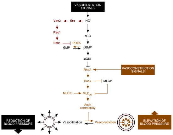 The control of systemic blood pressure is ensured, among other physiological responses, by regulating the contractility of blood vessels in real time. A key signal for this process is nitric oxide (NO) [17,18], a vascular endothelial cell-generated gas that favors the reduction in blood pressure via the induction of the vasodilatation or resistance arterioles. This process entails the disassembly of the F-actin cytoskeleton, of protein nitrosylation events, and of other signaling regulatory steps in NO-stimulated vascular smooth muscle cells (vSMCs) [17]. To induce the former response, NO promotes the step-wise stimulation of soluble guanylate cyclase [17,19], production of cyclic guanosine monophosphate (cGMP) [17,19], and the enzyme activity of the cGMP-dependent protein kinase type I [17,19,20] (Figure 2, pathway in black color). The latter enzyme triggers the phosphorylation of the RhoA GTPase that, in turn, causes the release of the GTPase from the plasma membrane and its disassembly from the downstream serine/threonine kinase Rock1 (Rho-associated coiled-coil-containing protein kinase 1) [21]. This leads to the vasodilatation-mediated reduction in blood pressure because the inactivation of Rock1 abrogates stress fiber formation via the concerted down- and upregulation of the 20 kDa myosin light chain (MLC20) and the MLC20 phosphatase (MLCP), respectively [22,23,24] (Figure 2). This NO-regulated vasodilatation pathway is negatively regulated by phosphodiesterase type 5 (PDE5), an enzyme that hydrolyzes cGMP [25] (Figure 2). The importance of this route in normal physiology is demonstrated by the observation that the inactivation of several signaling elements of this pathway using either genetic or pharmacological avenues leads to the rapid development of a hypertensive state [20,26,27,28,29,30]. Conversely, the use of PDE5 inhibitors (e.g., sildenafil, the active component of Viagra) restores most vasodilatation defects associated with hypertensive states and erectile dysfunction [25,31,32]. While this pathway had been known for a long time, the investigation of the cause of the hypertension exhibited by Vav2-deficient mice [33] allowed for the discovery of a new signaling branch that cooperates with the previously known pathway to favor the dilatation of resistance arterioles (Figure 2, pathway in red) [34]. This branch requires the Src-dependent phosphorylation and activation of Vav2 upon the stimulation of vSMCs with NO (Figure 2). Activated Vav2 leads, in turn, to the stimulation of Rac1, the Rac1-mediated translocation of the serine/threonine kinase Pak (p21–activated kinase), and the Pak1-mediated inactivation of PDE5 (Figure 2) [34]. This inhibitory step unexpectedly relies on the physical interaction of Pak1 with the N-terminal domains of PDE5, rather than on a transphosphorylation-dependent step. It is hypothesized that this inhibition step involves a conformational change in the target protein [34], given that the PDE5 N-terminus contains domains involved in both the homodimerization and the upstream regulation of PDE5 enzymatic activity [35]. The inhibition of PDE5 by Vav2 therefore ensures high levels of cGMP production in NO-stimulated vSMCs, thus favoring the sustained silencing of the RhoA pathway, effective vasodilation, and reduction in blood pressure (Figure 2) [34]. Further genetic evidence has demonstrated that this pathway is intrinsic to vSMCs and is dependent on the main Vav2 substrate, the GTPase Rac1 [36,37]. These results indicate that Vav2 is a natural “Viagra”-like molecule that ensures proper NO-triggered vasodilatation responses by limiting the enzyme activity of PDE5. Consistent with this idea, the development of the hypertension and its associated cardiovascular comorbidities can be prevented in Vav2–/– and vSMC-specific Rac1–/– mice using sildenafil treatments [34,36].
