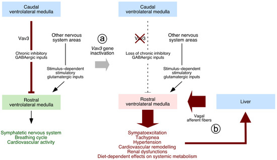 The use of Vav3–/– mice led to the discovery that vagal signals originated from peripheral tissues are essential for the consolidation of the systemic pathologies caused by RVLM-driven sympathetic hyperactivity [76]. In line with this, it was observed that the surgical or chemical elimination of the afferent vagal branch that goes from the liver to the brainstem eliminates all the cardiovascular and metabolic defects found in Vav3-deficient animals [76] (Figure 3, point b). The transmission to, and subsequent integration of these vagal nerve-transmitted inputs into the RVLM requires further investigation.