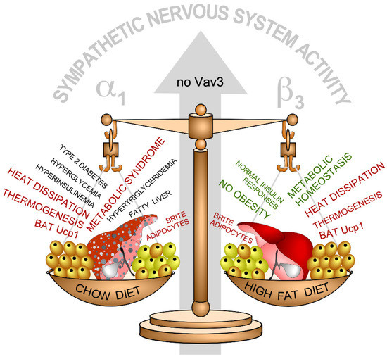 - Menacho-Marquez, M.; Nogueiras, R.; Fabbiano, S.; Sauzeau, V.; Al-Massadi, O.; Dieguez, C.; Bustelo, X.R. Chronic sympathoexcitation through loss of Vav3, a Rac1 activator, results in divergent effects on metabolic syndrome and obesity depending on diet. Cell Metab. 2013, 18, 199–211. [Google Scholar] [CrossRef] [PubMed]