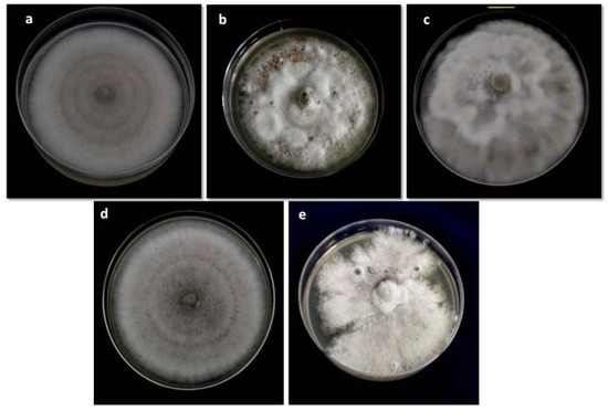 Colony characteristics were examined after which data were collected from the cultures grown on PDA [19]. Each of the isolates was cultured on PDA plates and incubated at 28 ± 2 °C. Diameter of the colony was measured daily for seven days after which the growth rate was measured as the average daily growth rate of the seven days. Colony characters, colour, topography, and margin shape were recorded on the 10th day of the incubation [21,22]. For each isolate, three replicates of the culture were evaluated. The spores of each isolate were collected in a sterilized conical flask with distilled water (100 mL) to determine strength of the sporulation. The suspension was blended for three minutes in a warring blender, after which the concentration of the purified conidia (100 mL) was measured using a haemocytometer [23].