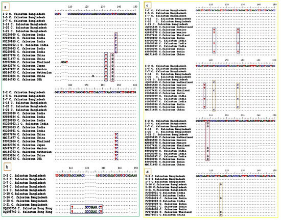 Nucleotides variation of C. falcatum isolates from Bangladesh compare with other countries isolates at different loci positions using (a) ITS (b) β-tubulin gene (c) Actin and (d) GADHP gene sequences.