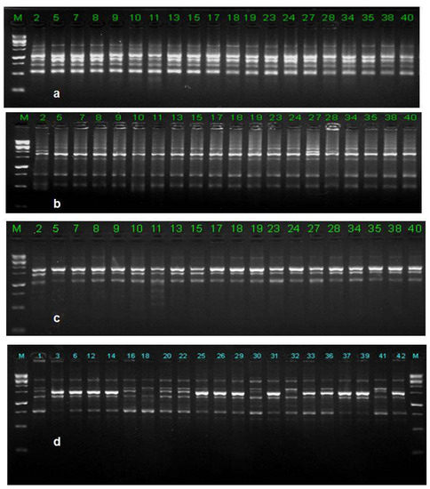 - Gupta, M.; Chyi, Y.S.; Severson, R.J.; Owen, J.L. Amplification of DNA markers from evolutionary diverse genomes using single primers of simple sequence repeats. Theory Appl. Genet. 1994, 89, 998–1006. [Google Scholar] [CrossRef]