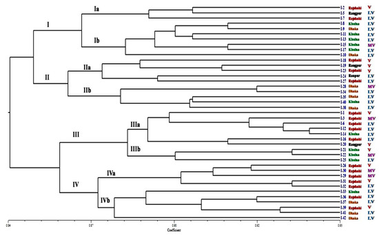 Using Nei’s gene diversity statistics, the genetic structure was explored further. The analysis of the occurrence of genetic variation revealed that mean the gene diversity within populations (Hs) and total gene diversity (HT) were 0.152 and 0.173, respectively (Table 6). The genetic diversity coefficient among the populations (GST) was 0.122. The GST value less than 1 suggests high level of genetic similarity and low degree of genetic diversity among the populations. The high level of genetic similarity in the population influenced the high level of gene flow among the population. Gene flow (Nm) among the populations was 3.584. The results of AMOVA revealed that 78% of the total variation occurred within the population isolates, whereas 22% of the variability was attributable to the difference among the populations (Table 7). A high degree of genetic identity occurred in Rajshahi (Raj) and Dhaka (Dha) populations. In contrasts, a comparatively low degree of genetic identity was observed in Khulna (Khu) and Dhaka (Dha) populations, with estimated identities of 0.991 and 0.970, respectively (Table 8). Based on ISSR marker data, cluster analysis was carried out to construct a dendrogram using UPGMA. The results revealed genetic associations in the populations (Figure 6). The highest value of cophenetic correlation (r = 0.919) was determined by the Jaccard similarity coefficient, suggesting a very strong match between the similarity coefficient and the clustering method. To estimate the genetic relationships between isolates, the UPGMA cluster analysis of Jaccard’s similarity coefficients generated a dendrogram that categorized the 41 C. falcatum isolates into four major clusters (Figure 8). Cluster I consisted of 10 isolates (I-2, I-5, I-7, I-8, I-9, I-10, I-11, I-13, I-15, and I-17). Cluster II consisted of 10 isolates (I-18, I-19, I-23, I-24, I-27, I-28, I-34, I-35, I-38, and I-40). Cluster III consisted of 10 isolates (I-1, I-3, I-6, I-12, I-14, I-16, I-20, I-21, I-22, and I-25).