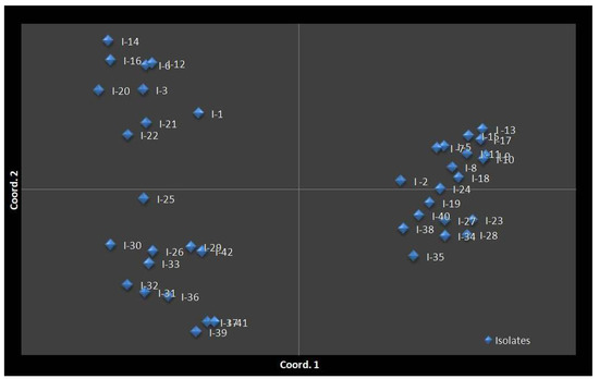 However, cluster IV consisted of 11 isolates (I-26, I-29, I-30, I-31, I-32, I-33, I-36, I-37, I-39, I-41, and I-42). Each cluster had two sub-clusters. The results suggest that the C. falcatum isolates collected from the same location/region belong to the same sub-cluster as noted in the clusters Ib, IIb, IIIa, and IVa. However, few of them belong to other sub-clusters/cluster indicating they are partially related to the geographical regions because of gene flow and planting materials exchanged from one region to another. Furthermore, the findings revealed that, genetic diversity correlated weakly with the virulence level of the tested isolates because the MV and V isolates had formed no specific cluster in the phylogenetic tree. PCoA results were consistent with those with cluster analysis. The PCoA results supported clustering into the four population groups (Figure 9).