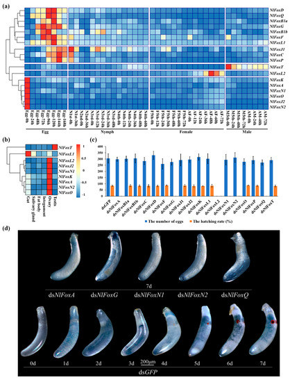 Our previous study has revealed that NlFoxN1 exhibits pleiotropism during embryogenesis and nymph molting [28]. The results of the RNAi experiments indicate that NlFoxA and NlFoxQ have a similar pleiotropism: they not only affect the egg hatching rate, but also play an important role in molting.