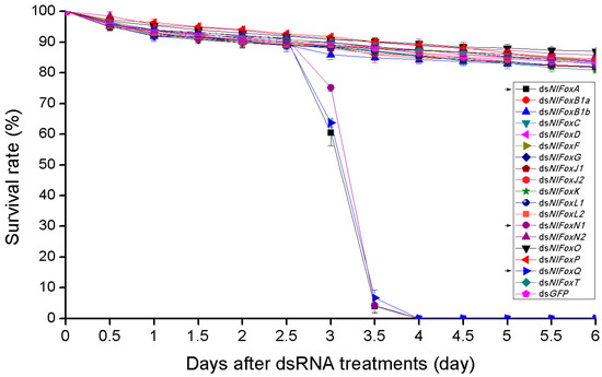 The double-stranded RNA (dsRNA) was synthesized from the purified DNA templates, which were prepared via the amplification of RT-PCR, which was accomplished using a T7 High Yield RNA Transcription Kit (Vazyme, Nanjing, China). A unique region of each gene was chosen as a template for dsRNA synthesis. The primers used for the dsRNA synthesis can be found in Supplementary Materials, Table S1. The dsRNA for GFP was used as a negative control for the nonspecific effects of dsRNA. Microinjection of planthoppers with dsRNA was carried out according to a previously reported method [21]. Briefly, dsRNA was injected into the membrane between meso- and meta-thoracic legs using a microinjection needle under a stereomicroscope. About 150 insects were used for each gene treatment, and each treatment was conducted in triplicate. Each insect was injected with 10 μL of dsRNA, at a concentration of 5 μg/μL. Samples were collected from a set of 6–10 insects to evaluate the RNAi effects of each gene. A second, non-overlapping region was selected for dsRNA synthesis to overcome possible off-target effects. The regions were designed to have no other similar sequences in the genome (Supplementary Materials, Figure S1).