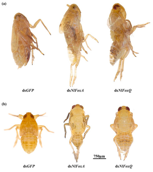 The depletion of NlFoxA or NlFoxQ in the eggs prevented the development of the eggs, resulting in a hatching rate of zero (Figure 2c). An injection of dsRNA for NlFoxA or NlFoxQ in the early fifth instar nymphs led to a lethal phenotype, after which the mortality rate reached almost 100% (Figure 3). All the dead BPHs exhibited the same phenotype. The dead BPHs failed to shed their old cuticles and died quickly during nymph-to-adult molting (Figure 4a). The same phenotype was found between the 4th-to-5th nymph molting after injecting NlFoxA or NlFoxQ dsRNA into the early fourth instar nymphs (Figure 4b).