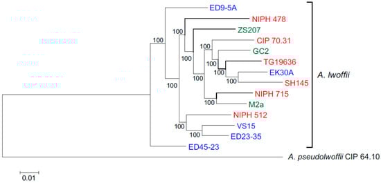 Genome-based phylogeny of A. lwoffii. The maximum likelihood tree is based on concatenated nucleotide sequences of 1585 single copy genes. Clinical, permafrost and other natural isolates of A. lwoffii are shown in red, blue and green, respectively. A. pseudolwoffii CIP 64.10 was used to root the tree.
