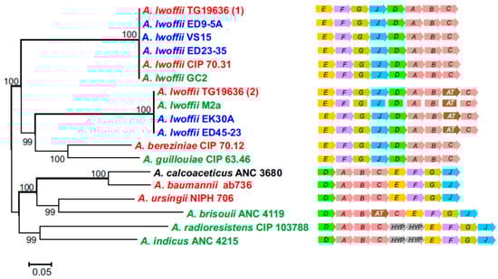Phylogenetic analysis of concatenated amino acid sequences of proteins (UreA, UreB, UreC, UreD, UreE, UreF, UreG, and UreJ) of the urease operons revealed clustering of two structural types of the operons in A. lwoffii, rather than operons of environmental and clinical strains of this species (Figure 2).