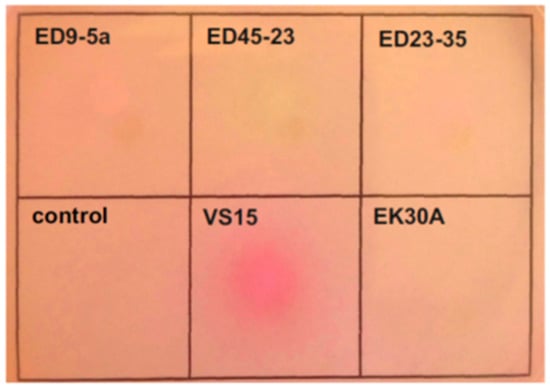 The ability of the permafrost strains to utilize urea as a nitrogen source was determined by inoculation on Christensen’s agar [50]. A change in the colour of the medium, reflecting a change in pH due to the hydrolysis of urea, was reliably detected only in the case of strain VS15 (Figure 3).