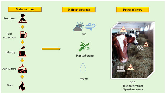 | Hg | Coal combustion, gold mining, pesticides, volcanic eruptions, wildfire | Ingestion of contaminated feed and water, inhalation | Brain, kidney, boses, blood, hair, liver | Damage of testicular cells reduces semen quality and spermatogenesis, increases oxidative stress, and damages sperm membrane Fetotoxic, Ataxia, neuromuscular incoordination, convulsions | [6,25,30,36] |