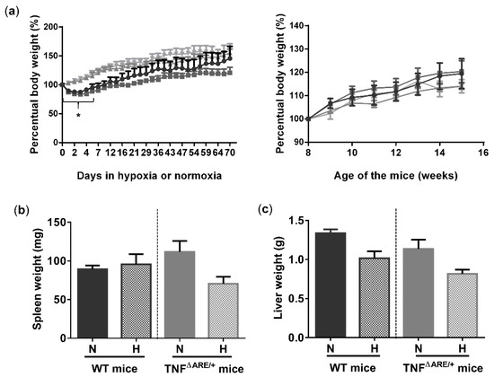 ) housed for 10 weeks in normoxia, all from 5 until 15 weeks of age. (b) Spleen and (c) liver weight of all mice measured at week 15. Data are represented as the mean ± standard error of the mean (SEM). N: Normoxia; H: Hypoxia. * p < 0.05.