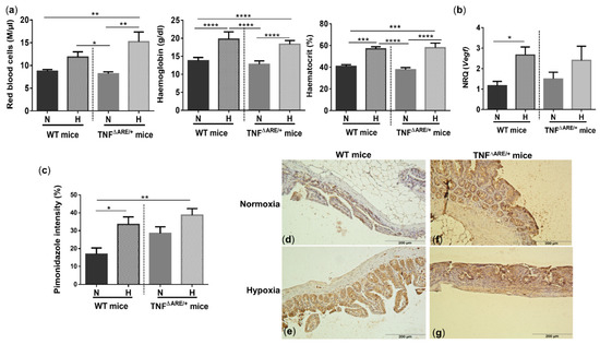 Systemic and ileal hypoxic markers are increased in mice housed in environmental hypoxia. (a) Red blood cells, haemoglobin and haematocrit concentrations, (b) ileal vascular endothelial growth factor (Vegf) mRNA expression and (c) ileal pimonidazole intensity in WT and TNF∆ARE/+ mice housed in hypoxia and normoxia. Representative images of the pimonidazole staining in a (d) WT mouse housed in normoxia; (e) WT mouse housed in hypoxia; (f) TNF∆ARE/+ mouse housed in normoxia and (g) TNF∆ARE/+ mouse housed in hypoxia. * p < 0.05, ** p < 0.01, *** p < 0.001, **** p < 0.0001. Data are represented as the mean ± SEM. N: Normoxia; H: Hypoxia.