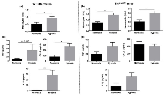 Given the clear presence of both systemic and ileal hypoxia in mice exposed to environmental hypoxia, we questioned whether this was associated with systemic inflammation. Therefore, we first compared the circulatory immune cell abundance in all mice. The number of total white blood cells did not differ between genotypes, nor between housing environments (Figure S2). However, hypoxia significantly increased the number of circulatory monocytes in both TNF∆ARE/+ and WT mice (p = 0.004 and p = 0.038, respectively) (Figure 3a,b). Next to monocytes, TNF∆ARE/+ mice housed in hypoxia also exhibited significantly higher numbers of circulatory neutrophils compared with TNF∆ARE/+ mice housed in normoxia (p = 0.023) (Figure 3b). No significant differences could be identified in the number of lymphocytes, eosinophils and basophils in both TNF∆ARE/+ mice and WT littermates independent of their housing environment (Figure S2). Next, we assessed whether the altered immune cell composition is associated with increased proinflammatory cytokine levels. Environmental hypoxia exposure tended to increase TNF (p = 0.067), but significantly increased CCL2 (p = 0.0158) and IL1β (p = 0.0005) levels in the serum of WT mice (Figure 3c). As expected, normoxic TNF∆ARE/+ mice exhibited an increase in circulating TNF, CCL2 and IL1β levels (p = 0.0297, p = 0.0023 and p = 0.1039; respectively) compared with normoxic WT littermates (Figure S3). However, hypoxia did not significantly increase these levels in TNF∆ARE/+ mice compared with normoxic TNF∆ARE/+ mice ((p = 0.1127, p = 0.6082 and p = 0.1675, respectively; Figure 3d).