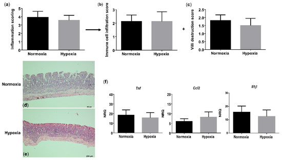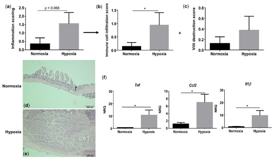 Long-term environmental hypoxia exposure in WT mice induces a proinflammatory ileal microenvironment. (a) Total histological inflammation score in WT mice housed in normoxia and hypoxia, comprising the subscores, (b) immune cell infiltration and (c) villi destruction. Representative images from haematoxylin-eosin (H&E) sections of the distal ileum from (d) a WT mouse housed in normoxia and (e) a WT mouse housed in hypoxia. (f) mRNA expression levels of Tnf, Ccl2 and Il1β in WT littermates housed in normoxia and hypoxia. * p < 0.05. Data are represented as the mean ± SEM. NRQ: Normalized relative quantities.