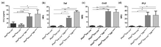 Haematopoietic deletion of Phd1 does not influence the proinflammatory gene expression profile in TNFΔARE/+ mice. (a) Serum levels of CCL2 and mRNA expression levels of (b) Tnf, (c) Ccl2 and (d) Il1β in the distal ileum of Phd1f/fVav:cre−/−, Phd1f/fVav:cre+/−, Phd1f/fVav:cre+/−TNFΔARE/+ and Phd1f/fVav:cre+/−TNFΔARE/+ mice. * p < 0.05; ** p < 0.01. Data are represented as the mean ± SEM. NRQ: Normalized relative quantities.