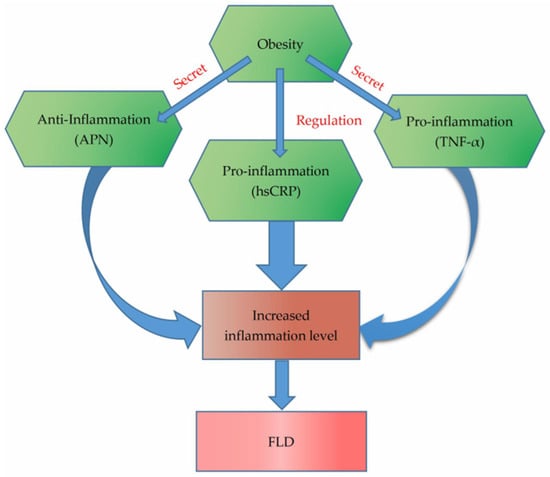 Accumulating evidence has shown that FLD is closely related to obesity and fat accumulation, especially for NAFLD [,,,]. Numerous epidemiology and animal studies have indicated that a higher body fat percentage is significantly associated with an elevated risk of FLD [,,,]. However, until now, the pathogenesis of obesity-related FLD remains unclear. Previous researchers speculated several hypotheses of mechanisms of obesity-related FLD progression, including insulin resistance, low-grade inflammation and intestinal microbiota, etc. [,,,]. Among these mechanisms, one important potential mechanism is chronic low-grade inflammation status induced by abnormal or excessive body fat accumulation [,]. In reality, adipose tissue is not only a main place to store excessive energy but also an important but usually neglected endocrine organ []. It can secrete a number of adipokines, including pro-inflammatory biomarkers (tumor necrosis factor-α, TNF-α, etc.) and anti-inflammatory biomarkers (Adiponectin, APN, etc.), and also it can indirectly regulate the inflammation status (C-reaction protein, CRP) []. Pro-inflammatory cytokines/chemokines are considered to be important biomarkers of adipose inflammation. Tumor necrosis factor-α (TNF-α) is an effective pro-inflammatory cytokine secreted by the macrophages and adipocytes, especially visceral adipose tissue. These cytokines are directly involved in insulin and glucose metabolism, and induce insulin resistance and stimulate lipolysis []. The liver is an important secretion organ for biomarkers of inflammation and endothelial dysfunction. TNF-α can induce the expression of high sensitivity C-reactive protein (hsCRP), fibrinogen and other acute-phase proteins [,]. It has been demonstrated that patients with NAFLD have elevated levels of fibrinogen and hsCRP []. In addition, previous studies have shown that TNF-α plays an important role in the development and progress of FLD [,]. Adiponectin is an anti-inflammatory adipocytokine. In the liver, adiponectin acts by activating 5-AMP-activated protein kinases and peroxisome proliferator-activated receptor-α pathways, as well as inhibiting Toll-like receptor-4 mediated signaling []. There is evidence that adiponectin decreases hepatic and systemic IR and attenuates liver inflammation and fibrosis [,].