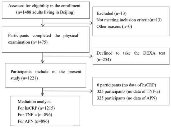 Flowchart of the study sample selection (dual-energy X-ray absorptiometry, DEXA; hsCRP, high sensitivity C-reactive protein; TNF-α, tumor necrosis factor-α; APN, adiponectin; FLD, Fatty liver disease).