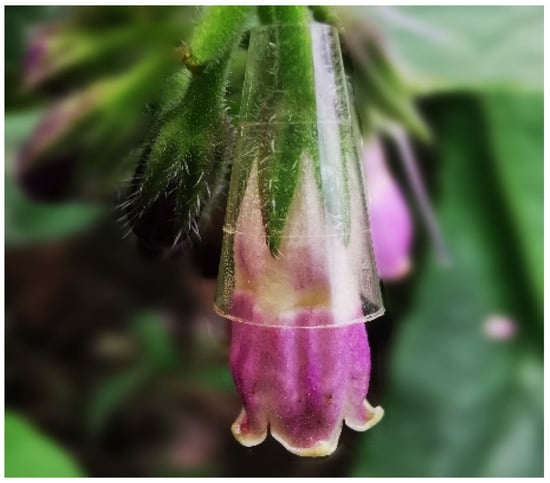 Flower of Symphytum officinale fitted at the base of corolla by a collar made of adhesive tape to prevent corolla from being pierced by nectar robbers.