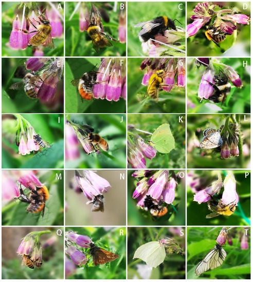Visitors of S. officinale. (A–L): Illegitimately visit flowers (IV), gather nectar on base of corolla. M–T: Legitimately visit flowers (LV), gather nectar through the corolla entrance. (A) Bombus picipes, (B) Bombus longipennis, (C) Bombus lucorum, (D,M) Bombus hedini, (E,N) Bombus ladakhensis, (F,O) Bombus kashmirensis, (G,P) Bombus laesus, (H) Bombus lantschouensis, (I) Megachile rotundata, (J,Q) Apis mellifera, (K,S) Gonepteryx mahaguru, (L) Everes argiades, (R) Ochlodes subhyaline, (T) Aporia crataegi.