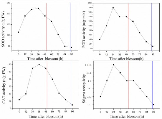 The dynamics of stigma receptivity and activity of POD, SOD and CAT over time after blossom. “−” means the stigma is not receptive; “−/+” means that some of the stigmas are receptive; “+” means the stigma is receptive, and more “+” symbols mean the stigma is strongly receptive. The red vertical lines refer to time of natural corolla abscission, and the blue vertical lines refer to time of corolla abscission after anti-robbing.