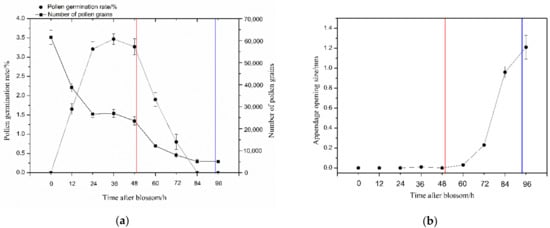 (a) The dynamics of the pollen germination rate and number of pollen grains over time after blossom; (b) appendage opening size over time after blossom. The red vertical lines refer to time of natural corolla abscission, and the blue vertical lines refer to time of corolla abscission after antirobbing.