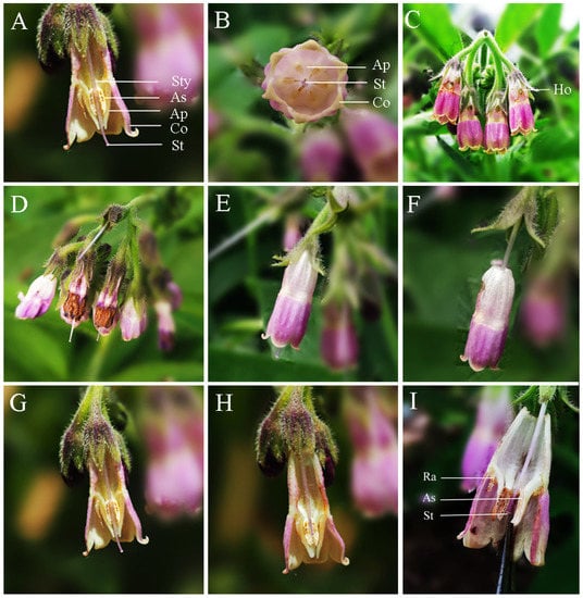 The floral traits and process of corolla abscission. (A–C) The morphological characteristics for S. officinale, comprising stamens and pistil in the opening flower. St, stigma; Co, corolla; Ap, appendages; As, anther sac; Sty, style; Ho, holes made by nectar robbers. (D) The wilted flower in the insect-excluding bags. (E,F) Corolla abscission and slipping along the style. (G,H) Anther movement and the process of self-pollination upon corolla abscission. (I) The process of corolla abscission after removal of appendages: Ra, residues of appendages; As, anther sac; St, style.