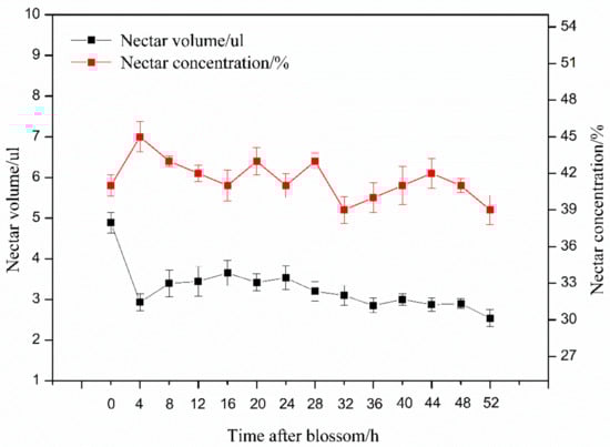 The volume and concentration of nectar every 4 h after blossom. The red line refers to nectar concentration and the black line refers to nectar volume.