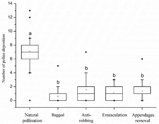 Comparison of pollen deposition number between different treatments. Boxplots show medians, quartiles, interquartile ranges and outliers. Different letters on items indicate significant difference at the 0.05 level.