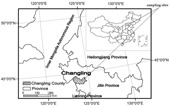 The study area was located in Changling County, southwestern section of the Songnen Plains, within the eastern region of the Eurasian steppes (44°40′–44°44′ N, 123°44′–123°47′ E) at an altitude range of 110 to 180 m (Figure 1). The site was characterized by a semi-arid continental monsoon climate, with cold, dry winters and warm, rainy summers. The annual mean temperature ranged from 4.6 to 6.4 °C. The annual precipitation ranged between 280 and 400 mm, with 70% of the precipitation falling between the months of June and August [29]. The main soil type was characterized by high salinity and alkalization (pH 8.3 to 10.0). Artemisia anethifolia, Kochia scoparia, and Artemisia scoparia were determined to be the common species at the alkaline sites. Artemisia anethifolia is the most salinity-tolerant Artemisia plant, which forms small communities on meadow grassland and dry grassland. The increase in this artemisia is often a sign of overgrazing or grassland degradation. In addition, the growing season is from May to September each year, which is the golden period for field experiments in Northeast China. So, we selected Artemisia anethifolia as our experimental species. Two types of land cover were selected within the study area: A. anethifolia and bare soil. The treatments included the original and mowing of the above-ground plants.