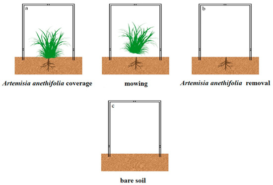 Schematic diagram of the experimental design: (a,b) Artemisia anethifolia coverage and removal; and (c) Bare soil.