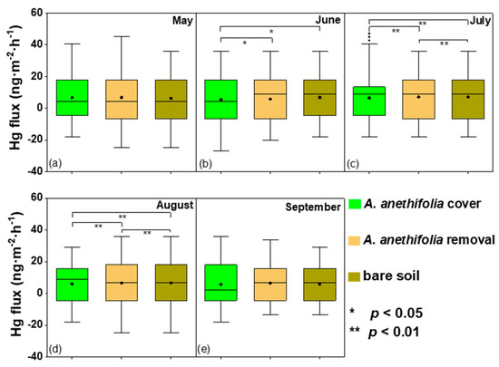Box plots of the soil-air Hg exchange fluxes for the three examined conditions (Artemisia anethifolia coverage, Artemisia anethifolia removal, and bare soil) from May to September 2018. *: In the figure, the asterisk represents a significantly different flux compared to the other plots during the same season; sub figure (a–e) represents May to September 2018; * p < 0.05; ** p < 0.01.