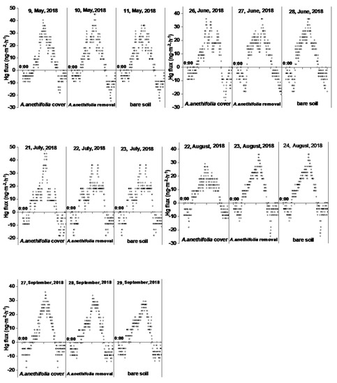 In the present study, there were clear diurnal fluctuations in the Hg fluxes under the three conditions, as illustrated in Figure 3. Generally speaking, Hg was released from the soil to the air during the daytime and deposited from the air to the soil during the nighttime, with peaks occurring during the middle of the day at the same time as the peaks in solar radiation. This was one of the reasons why solar radiation was considered to be the most important environmental parameter affecting the emissions of soil mercury to the atmosphere. That conclusion agreed well with the findings of previous studies [29,43]. The turning points of the emission and deposition processes were approximately 6:00 (morning) and 18:00 (evening). It was observed that in nearly all cases, the peaks of the Hg fluxes from the soil surfaces with vegetation coverage were lower than those with vegetation removed.